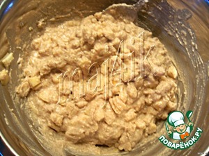 В мисочку выложить рикотту, 50 гр. сахара, ванильный сахар, корицу, порубленные грецкие орехи и 1 яйцо.