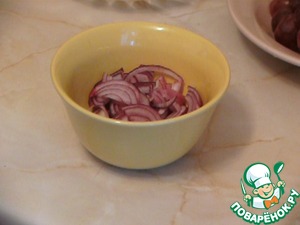 Нарезать лук. Залить его кипятком на 5 минут. После слить воду, добавить щепотку сахара, лимонный сок или уксус - пол чайной ложки. Выкладываем лук на дно салатника.