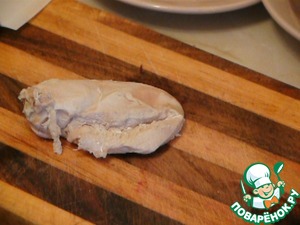 Нарезать куриную отварную грудку на небольшие кусочки.