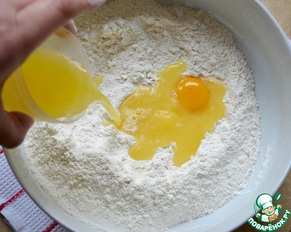 Из 1 апельсина выжать сок. Но, так как все апельсины разные, имейте ввиду, что должно получиться 100-120 мл сока. В большую миску просеять муку, сделать в центре углубление и положить желток (белок оставляем для начинки ). Добавить 1 ст. л. сахара и апельсиновый сок.