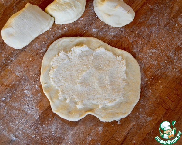 Подошедшее тесто выложить на рабочую поверхность, обмять. Разделить на шарики и каждый расплющить в лепёшку. Намазать на всю поверхность лепёшки начинку.