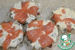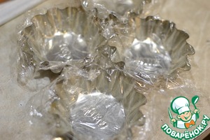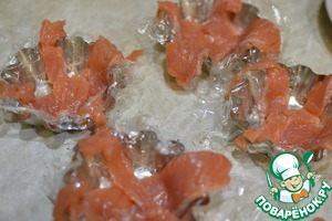 Уложить в формочки полоски рыбы крест-накрест так, что бы края свисали.