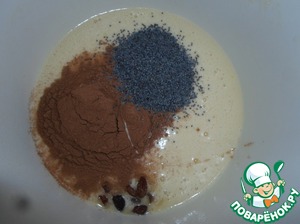 Добавляем изюм, мак, ванилин, соль, и какао, перемешиваем.