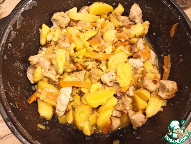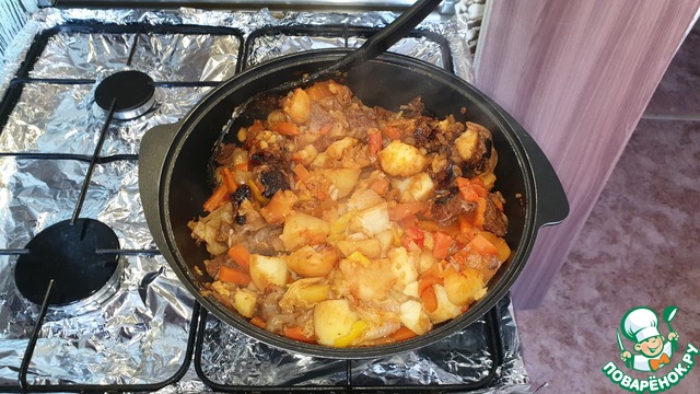 Потом репка. Принцип такой: чем продукты более долговаркие, тем ниже они должны находиться. Вот, поэтому, мясо и коренья вниз.