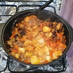 Вот теперь под этой конструкцией и нужно развести огонь. Сначала средний, чтобы расплавить жир (прислушиваюсь к казанку), потом посильнее, чтобы прогреть стенки казанка, а потом, как забулькает, делаю самый маленький. Теперь на маленьком огне эта штука простоит примерно 2 часа. -