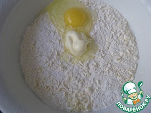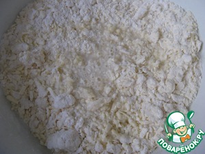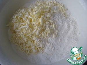 Просеять муку и перемешать с солью, на крупной терке натереть маргарин, смешать.