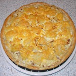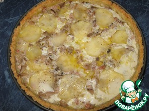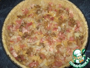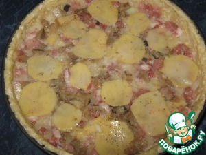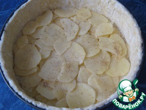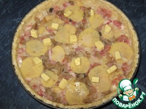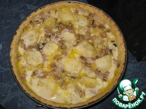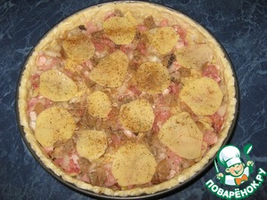 И последняя часть начинки - картофель, мясо, лук, грибы, оставить несколько кружочков картофеля и выложить их сверху.