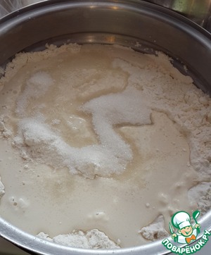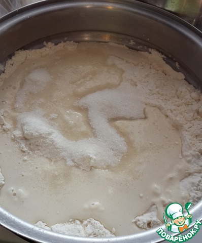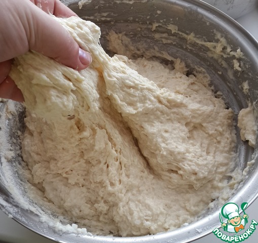 Тесто должно получиться чуточку липким и не крутым. Теперь накройте его плёнкой и оставьте в холодильнике на ночь ( от 12 до 18 часов).