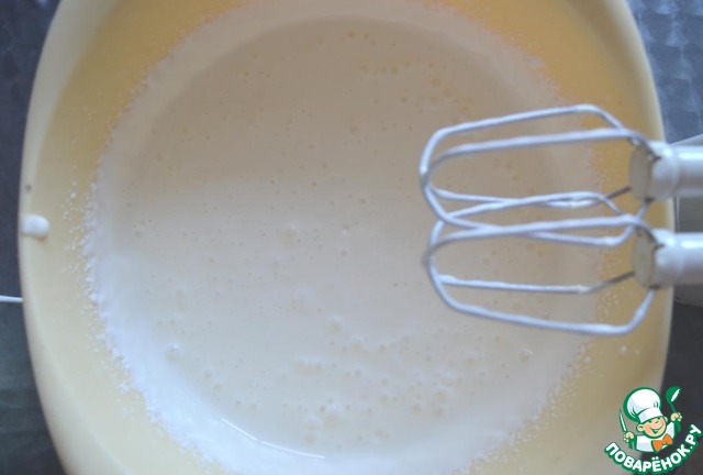 Теперь займёмся творожным слоем. Набухший желатин (15г) смешиваем с 50 мл молока, прогреваем на огне до растворения желатина. 150 мл молока выливаем в творог, хорошенько перемешиваем, затем взбиваем миксером. Добавляем желатин, сахар по вкусу, ванильный сахар. Всё хорошенько взбиваем.