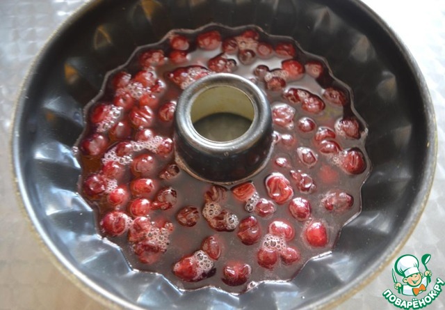 Размороженную вишню кладём в форму, аккуратно распределяем по форме. Набухший желатин (20г) выкладываем в ковш, добавляем сахар, корицу, кагор и начинаем подогревать до растворения желатина и сахара. Как всё растворилось, добавляем сок (у меня разведённый в воде вишнёвый сироп). Пару минут всё прогреваем. Выливаем в форму на вишню. Убираем на холод.