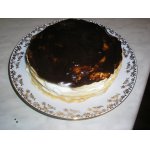 Вот и дождались. Торт у нас застыл. Берём блюдо, переворачиваем форму на блюдо и прогреваем феном форму. От тепла торт отходит от формы. Резким движением встряхиваем форму и вот торт оказывается на блюде. Если с первого раза не получилось, прогреваем ещё чуток и опять встряхиваем. Получилось!