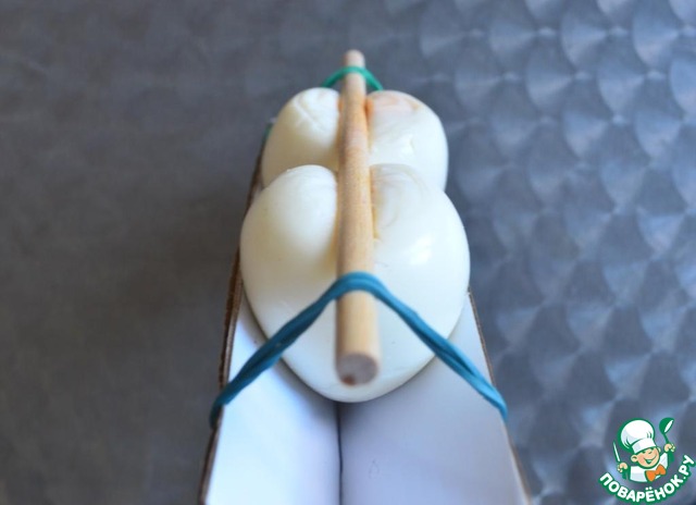 • А теперь расскажу, как из яиц делать сердечки. Сначала подготовить картонку, палочку и 2 резинки. Потом сварить яйца, тут же горячими очистить и закрепить как на картинке.