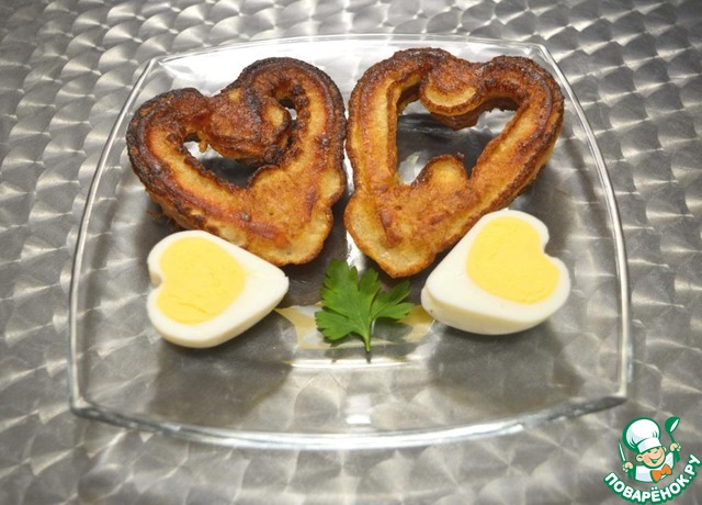 • Как наш кляр запенился, начинаем жарить сердечки. Берём сердечко и аккуратно обмакиваем его в кляре. Тут же выкладываем на разогретую сковороду с маслом (масло любое на ваш вкус). Обжариваем сердечки с двух сторон. Вот, в принципе, и всё! Выкладываем на тарелку, украшаем и подаём к столу. (Не забудьте вынуть шпажки, а то удовольствие может превратиться в трагедию!)