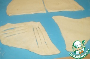 • Разделить тесто на 3 части, каждую раскатать в круг и разрезать на 4 части. Сделать на каждом кусочке надрезы, как показано на фото