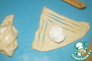 • Каждый шарик положить на подготовленные кусочки теста. Накрыть сначала уголком с двумя надрезами, затем сверху накрыть стороной с тремя надрезами. Таким образом "пеленаем" оставшиеся заготовки.
