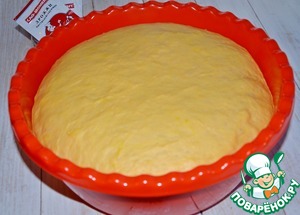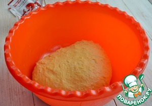 Тесто получается липким, переложить его в большую емкость так как оно должно подняться в три раза и оставить для брожения на час-полтора. -