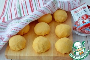 Вынуть тесто из холодильника и дать ему согреться при комнатной температуре примерно 60 мин (можно поставить емкость с тестом в микроволновку со стаканом горячей воды, там оно согреется быстрее... микроволновку не включать). Далее, выложить его на припыленную мукой поверхность, разделить на 16 частей