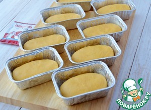 Выложить в смазанные маслом формочки ( у меня прямоугольные из алюминиевой фольги формы объемом 150 мл)... булочки выкладывать швом вниз.