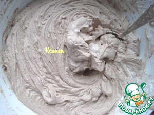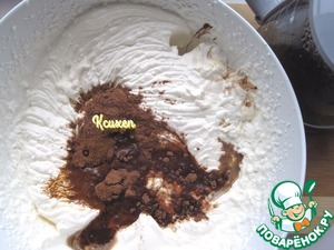 К сливочной массе добавляем коньяк, какао-порошок, охлаждённый кофе, ванилин и снова всё взбиваем.