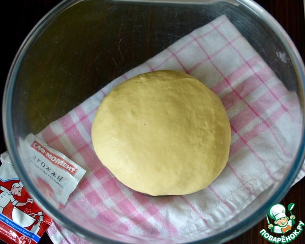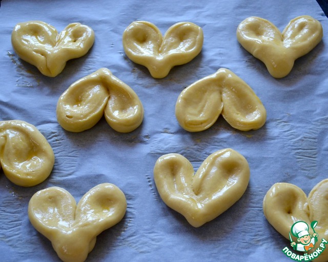 Выложить приготовленные таким образом все заготовки на противень, застеленный пекарской бумагой. Накрыть полотенцем и оставить на 15-20 минут. За это время включить разогреваться духовку на 175-180 градусов. Перед выпечкой смазать булочки яйцом.