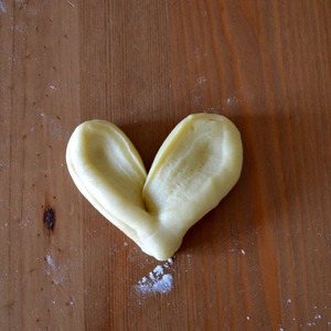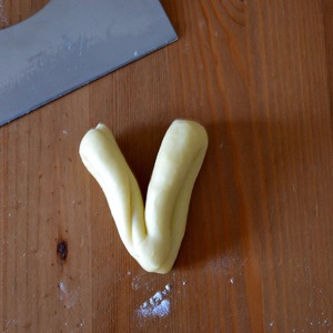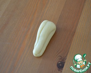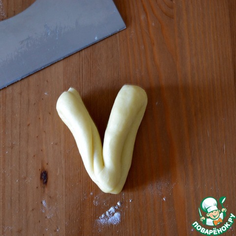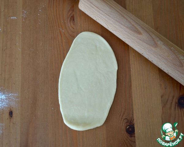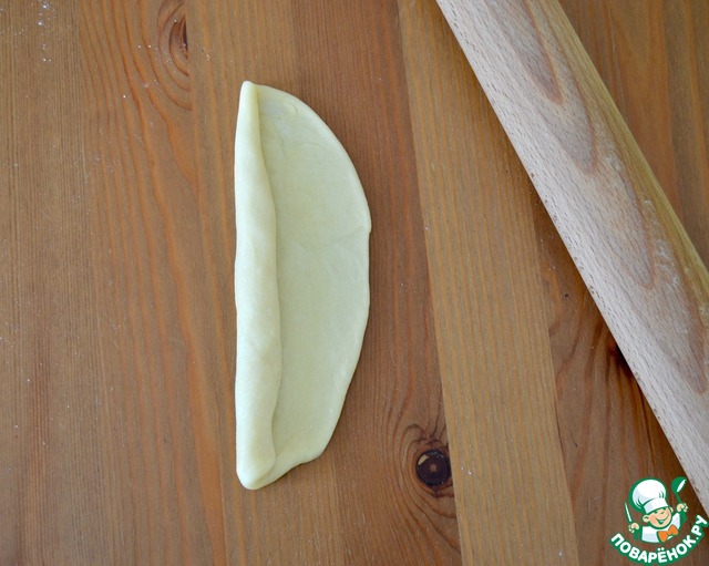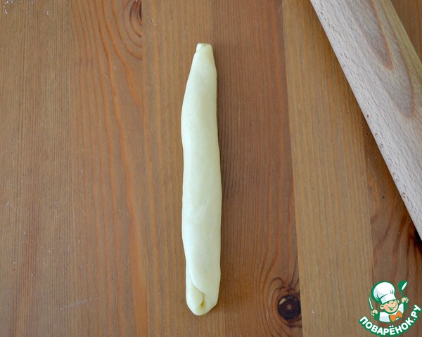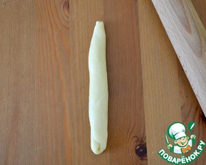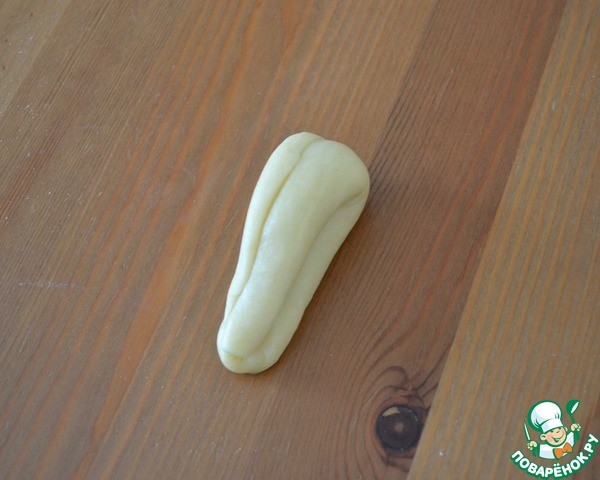Каждый кусочек раскатать в длинную лепешку (как на фото).