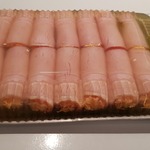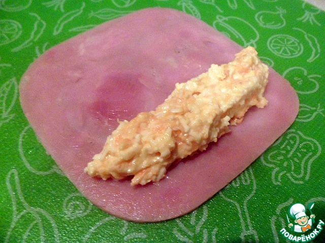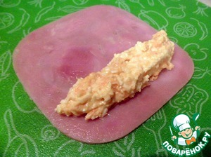 На ломтики ветчины выкладываем по 1ч. л. начинки и сворачиваем рулетики.