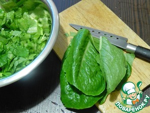 Листья салата промыть, обсушить и нарезать. Для заправки смешиваем оливковое масло с бальзамический уксусом и миндальной эссенцией.