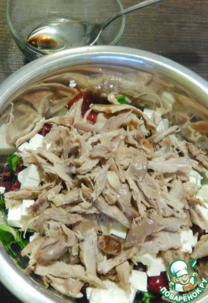 Нарезаем фету и остывшее мясо утки. Заправляем и подаем.