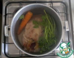 Добавил сразу одну морковь и пучок петрушки. Они мне нужны для бульона, потом я их выброшу. Как закипит, снимаю пену и оставляю вариться на минимальном огне. Для аромата бульона добавляю душистый перец и лавровый лист. Пока займусь луком и капустой.