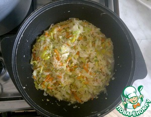 Продолжаю тушить капусту с луком, подливая, при необходимости, бульон.