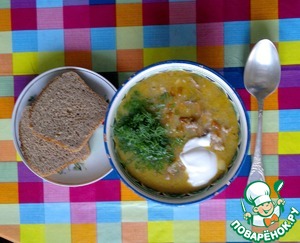 Итак, процесс близится к завершению. Выкладываю в кастрюлю мясо утки, присаливаю и приперчиваю по вкусу, варю ещё минут 5 и можно подавать к столу. В тарелку добавляю укроп и сметанку. А кто любит, можно мелко порезать и зубчик чеснока.