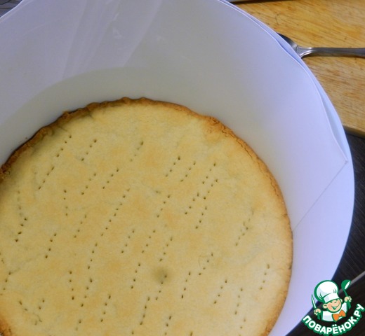 Для сборки торта необходимо нарастить борта формы с песочным коржом. Можно это сделать плотным картоном в пленку обернутым, у меня есть для этих целей разрезанная пластиковая салфетка под горячее.
