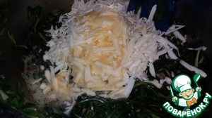 Сыр и яйца отправляем к зелени. Солим, перчим, добавляем зиру.