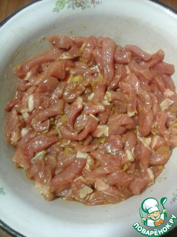 Залить свинину маринадом, перемешать, оставить на 15-30 минут.