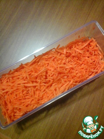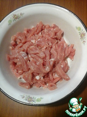 Убираем морковь со сковороды. вливаем туда 3 столовые ложки масла и обжариваем на сильном огне свинину 3-5 минут.