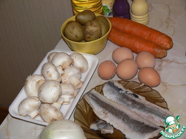 Подготовить продукты для салата "Лисья шубка". Картофель и яйца отварить и почистить.