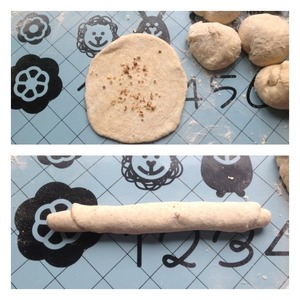 Раскидать тесто на небольшие клубочки ( чуть больше чем на пирожки). На 1 хлеб уйдет 8 шариков. Шарики раскатать в круг и посыпать специями. Каждый шарик свернуть в рулет.