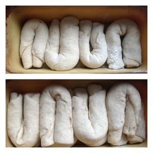 Каждый рулет согнуть пополам. В форму для хлеба выложить 4 согнутых пополам рулета, чередуя их по очереди как на фото. На верх выложить еще 4 сложенных пополам рулета. Смазать желтком и дать постоять минут 20. Затем отправить в духовку при 200 гр до готовности.