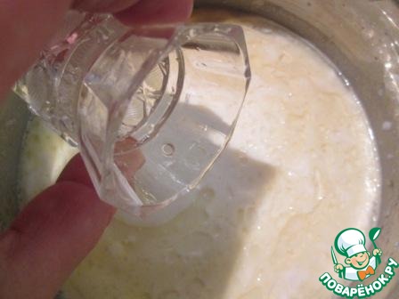 Добавить молоко, сметану, растительное масло, яйца (предварительно слегка взбитые вилочкой для лучшего вмешивания). Влить водку. Размешать.