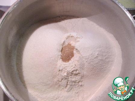 В большую емкость (у меня кастрюля на 5 л.) просеять 950 гр. муки, смешать ее с сахаром и дрожжами.