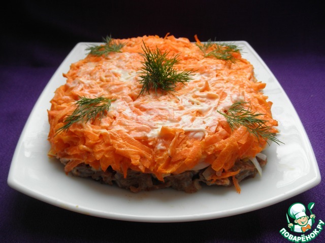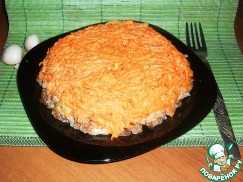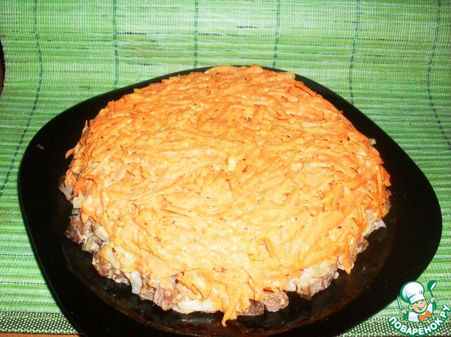 Третий слой - морковь. Смешали с заправкой - и на лучок.