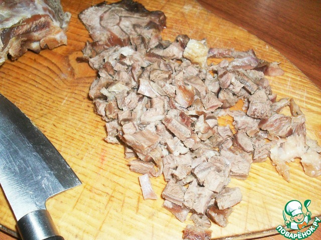 Готовую говядину остужаем и нарезаем кубиками. В идеале-разобрать на волокна (не мелкие). Мне пришлось порезать, а то мясо попалось жилистое, видать, корова была пенсионерка...