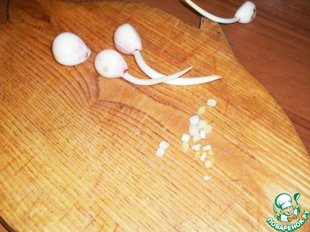 Чеснок мелко рубим ножом. Именно рубим, никакого пресса. Необходимо, что бы кусочки чеснока чувствовались. У меня был чеснок со стрелками, их я тоже пустила в дело. Добавляем к заправке и перемешиваем.
