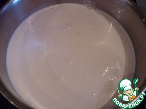 Желтки соединить с сахарной пудрой и сахаром, взбить в крем. Постепенно влить в желтки горячие сливки, взбивая венчиком.