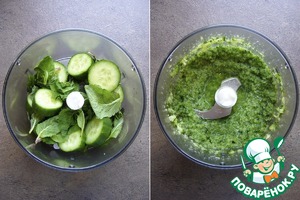 Огурец взять в пропорциях один к одному с мятой и измельчить при помощи блендера.