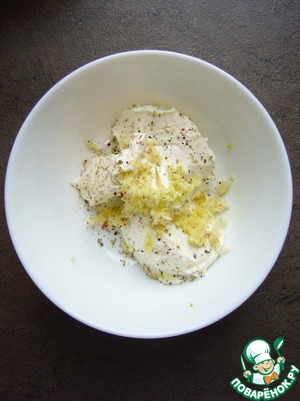 Творожный сыр смешать с измельченным чесноком, добавить сок лимона. Посолить, поперчить по вкусу.