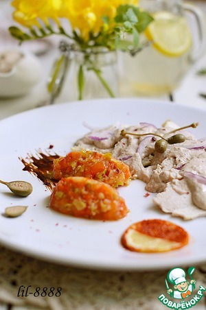 Холодная закуска из куриного филе с соусом из тунца и икрой из овощей по мотивам телятины "Вителло тоннато". Одна из любимых нами закусок. Очень вкусно, готовится совсем просто и на праздничном столе займет достойное место. Можно подать как на блюде для домашнего ужина, так и порционно для гостей.