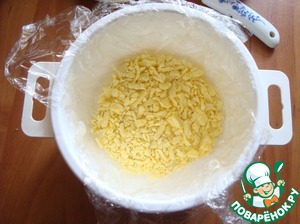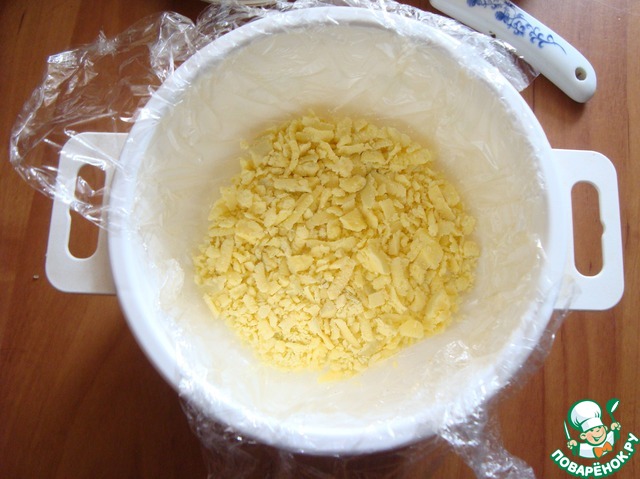 Салат делаем слоями. Я делаю этот салат в посуде с крышкой, выстланной пищевой плёнкой с D-12 см. Сваренные вкрутую яйца делим на белок и желток. Желток натираем на тёрке и выкладываем в самый низ+майонез.