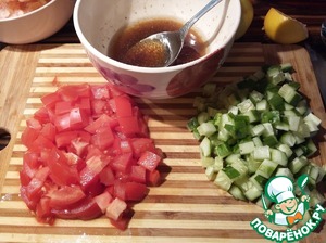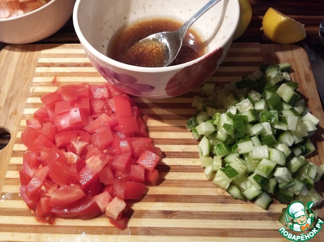 • Нарезаем кубиками приблизительно 1 на 1 см. огурцы и помидоры.