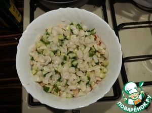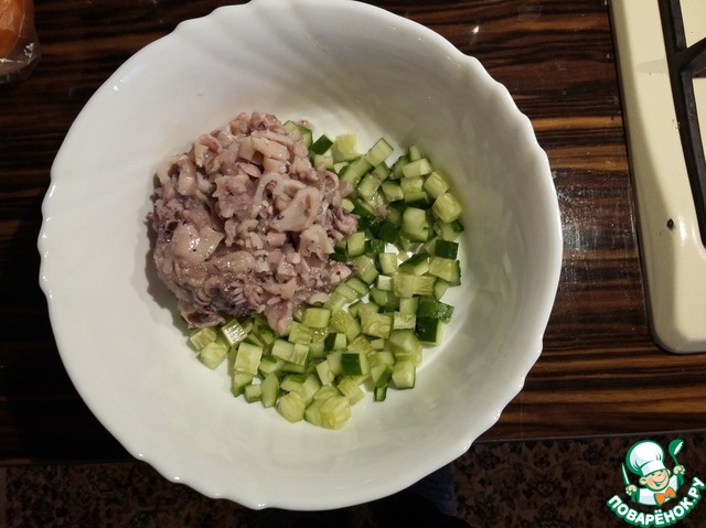 • Огурцы выкладываем в салатницу нижним слоем и на них выкладываем слоем каракатицу, порезанную примерно тоже 1 на 1 см. Заправляем равномерно 1 ст. ложкой заправки.